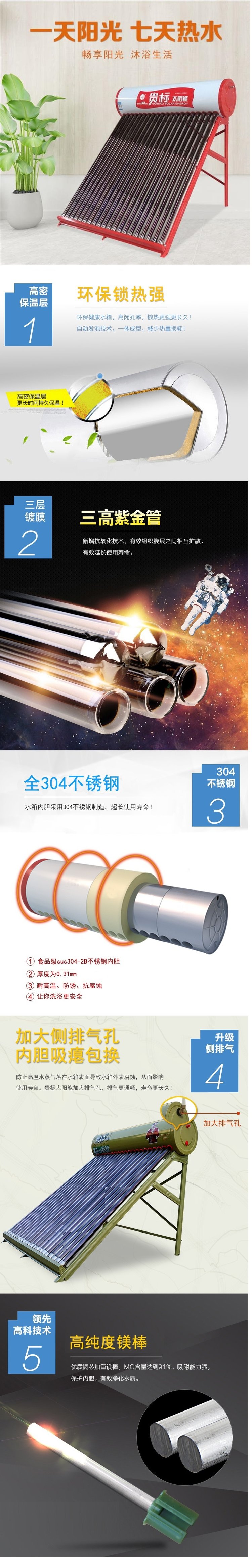 贵标集成太阳能支架上海宝钢原厂定做扎实耐用,1.6厚进口级轿车烤瓷工艺,50公分宽厚实耐用。真空管镀膜13层,热效率更高,真正三高紫金钻管,真正德国进口SU304内胆,品质好,敢承诺,五年包换,十年保修。厂家实力雄厚,生产设备先进,技术人员配备齐全,大宗原材料采购所以价格实惠,一件也是批发价, 真正的实惠到家!